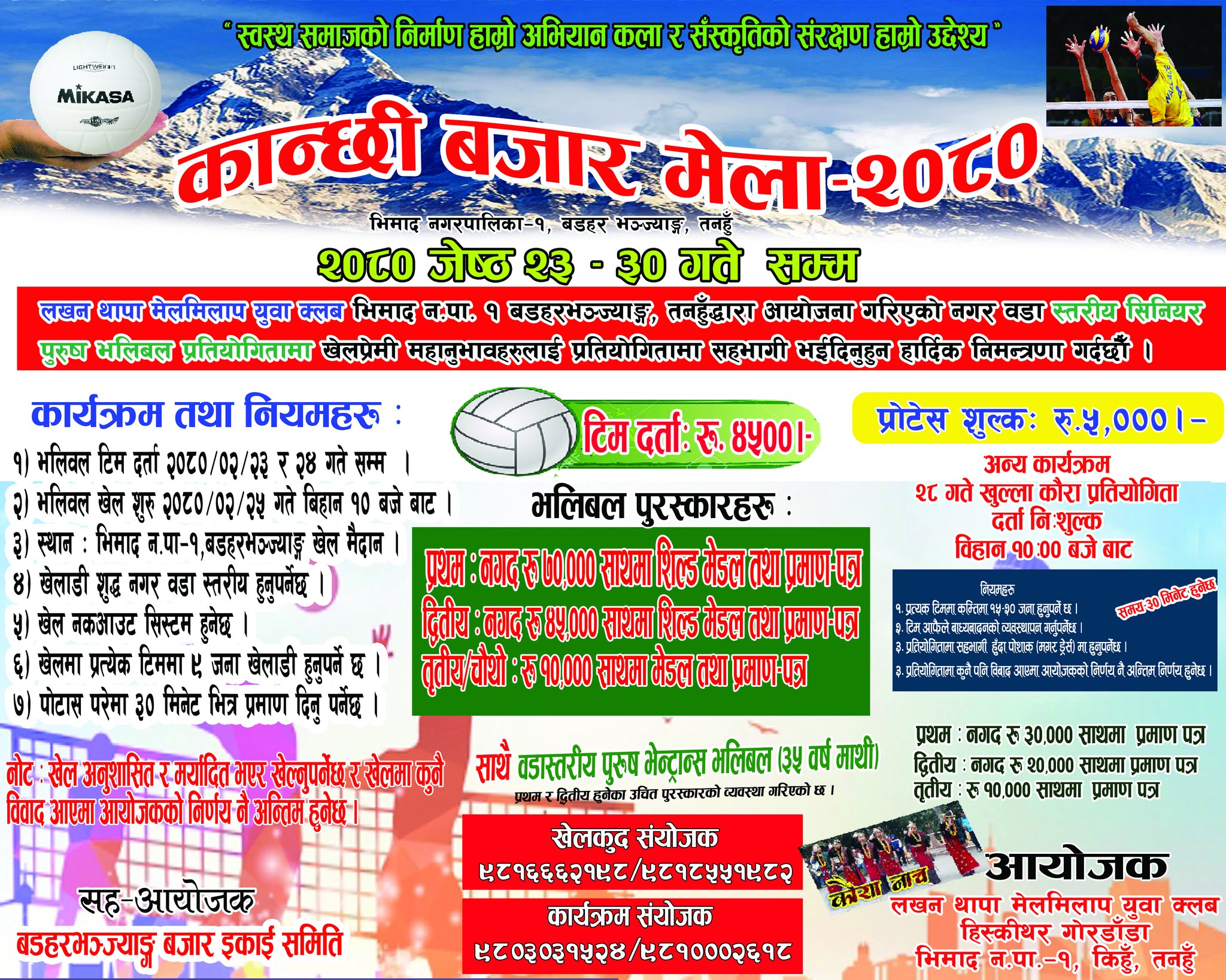 भलिबल प्रतियोगिता सँगै आयोजना गरिएको मेलामा स्थानीय उत्पादनको बिक्रीवितरण तथा स्थानीय तथा राष्ट्रिय कलाकारहरुको प्रस्तुति रहने सचिब श्रेष्ठले बताए । उनका अनुसार मेला तथा भलिबल प्रतियोगिताका लागि विभिन्न उपसमितिहरु बनाएर काम अगाडी बढाईएको छ ।